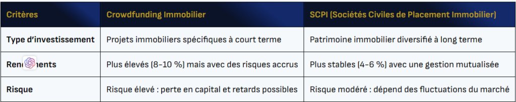 Les SCPI conviennent davantage aux investisseurs cherchant une solution plus stable et pérenne, dans une logique de diversification patrimoniale à long terme.